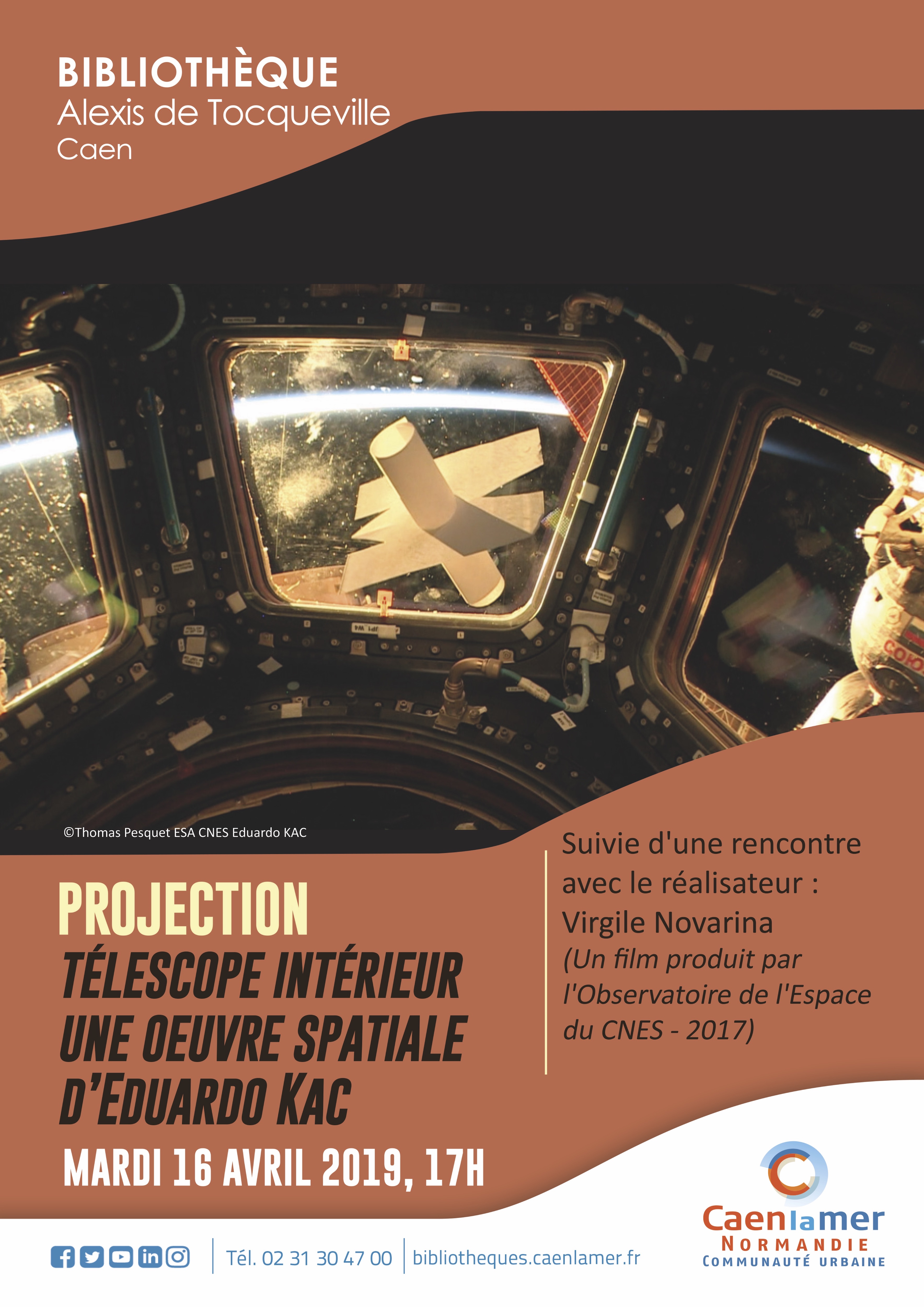 Une projection du film « Télescope intérieur, une œuvre spatiale d’Eduardo Kac » sera organisée à la bibliothèque Alexis de Tocqueville le mardi 16 avril à 17h à CAEN.